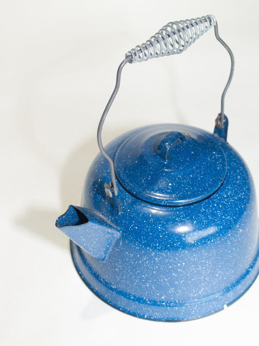 Vintage Classic Blue Speckled Rustic Enamelware Tea Kettle w/ Metal Wire